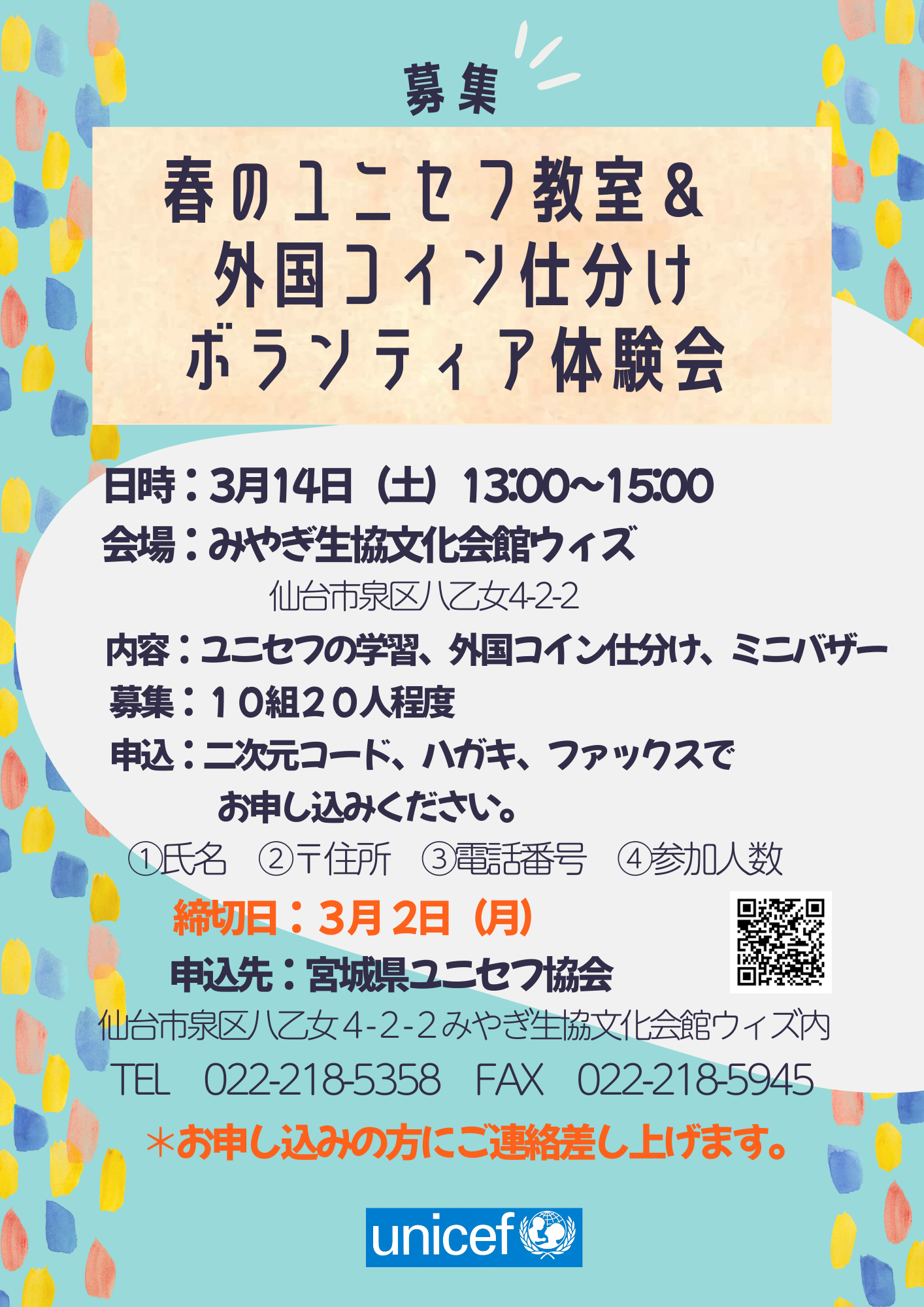 「春のユニセフ教室&外国コイン仕分けボランティア体験会」参加者募集